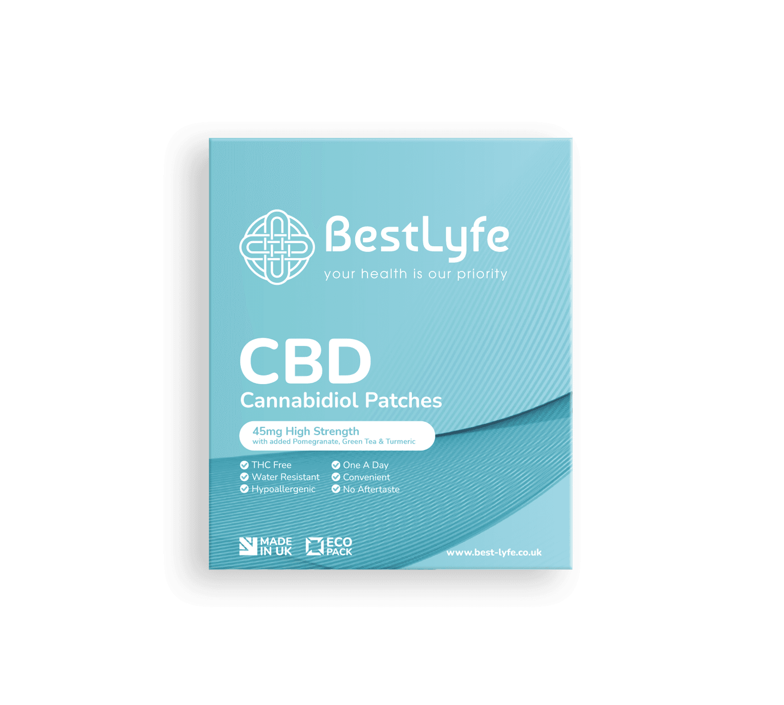 BestLyfe 45MG CBD Patches – pack of 30.. A higher-strength patch to help you manage stress, anxiety and more with a continuous CBD delivery system. BestLyfe’s 45mg patches contain added active ingredients: Pomegranate, Green Tea and Turmeric.. Discreet and effective, hemp patches can help you manage pain or insomnia. CBD patches are designed to be a discreet and continuous CBD delivery system. CBD 45mg infused patches.. Benefits of patches:. Transdermal – placed directly on the skin. Over a 24-hour period the recommended daily allowance of high strength hemp is released directly into your blood stream. Nothing to do after putting it on. Feeds the body every hour of every day EVEN while you are sleeping. Most popular way of taking hemp for people who have never tried before due to the inability to take too little or too much. VEGAN | THC FREE | GLUTEN FREE. Directions For Use:. Patches are applied to a relatively hair free part of your body (inner arm, lower back or shoulders are ideal). We recommend that you do not exceed one patch per day and that they are changed at the same time each day.. Storage:. Store this product in a cool, dry place. Keep out of direct sunlight. Keep out of sight and reach of children. Dosage:. 1 per day.. Up to 45mg CBD. Our CBD patches are available in two strengths to suit your needs. Using a low dose may help to manage milder stresses, anxieties or pain. Learn more about how hemp can help general wellness here. A higher dose may help you manage chronic pain, such as arthritis or muscle & joint pain, throughout the day with a continuous hemp delivery. Whether you’re looking for a day free from that aching pain, or a day without stress, our hemp patches may be able to help.. Stress-free. CBD patches are super easy to take, discreet and effective. Simply apply the patch (once you’ve found a good spot for it – we’d recommend a hairless area!) and you’re good to go! The hemp will passively enter your bloodstream through your skin. No pills to swallow or oils to sit under your tongue, perfect for on-the-go! Our customers love our hemp patches as their monthly subscription wellness product. Learn more about our subscriptions here.. Our patches have a fixed dosage allowing you to control how much hemp you take, empowering you to take control of your wellness.